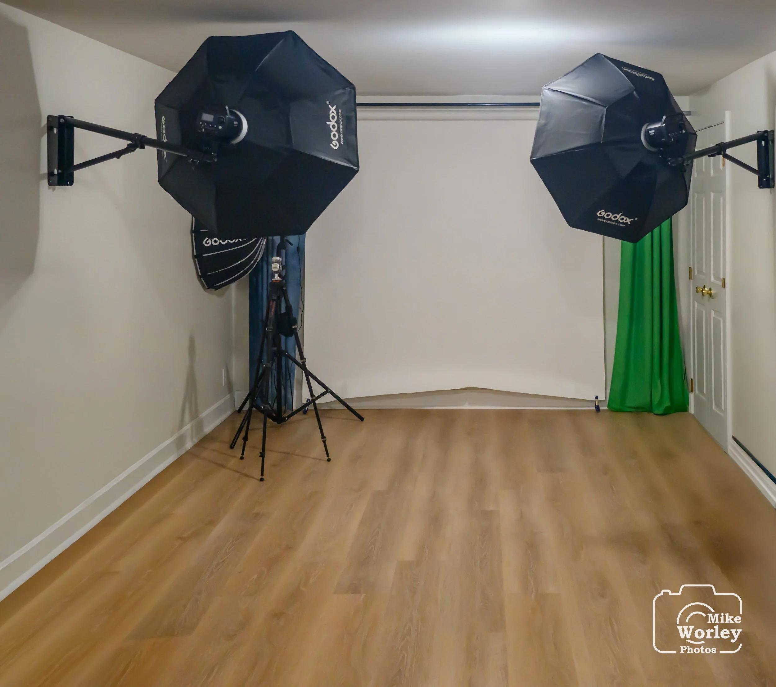 Two Godox 34 inch soft boxes mounted on Neewer wall mounts. I find these are better for a small studio - mine is 13’ wide - than having several stands on the floor. They can be adjusted from ceiling height to nearly touching the floor, and at various angles. They also fold against the wall for storage.