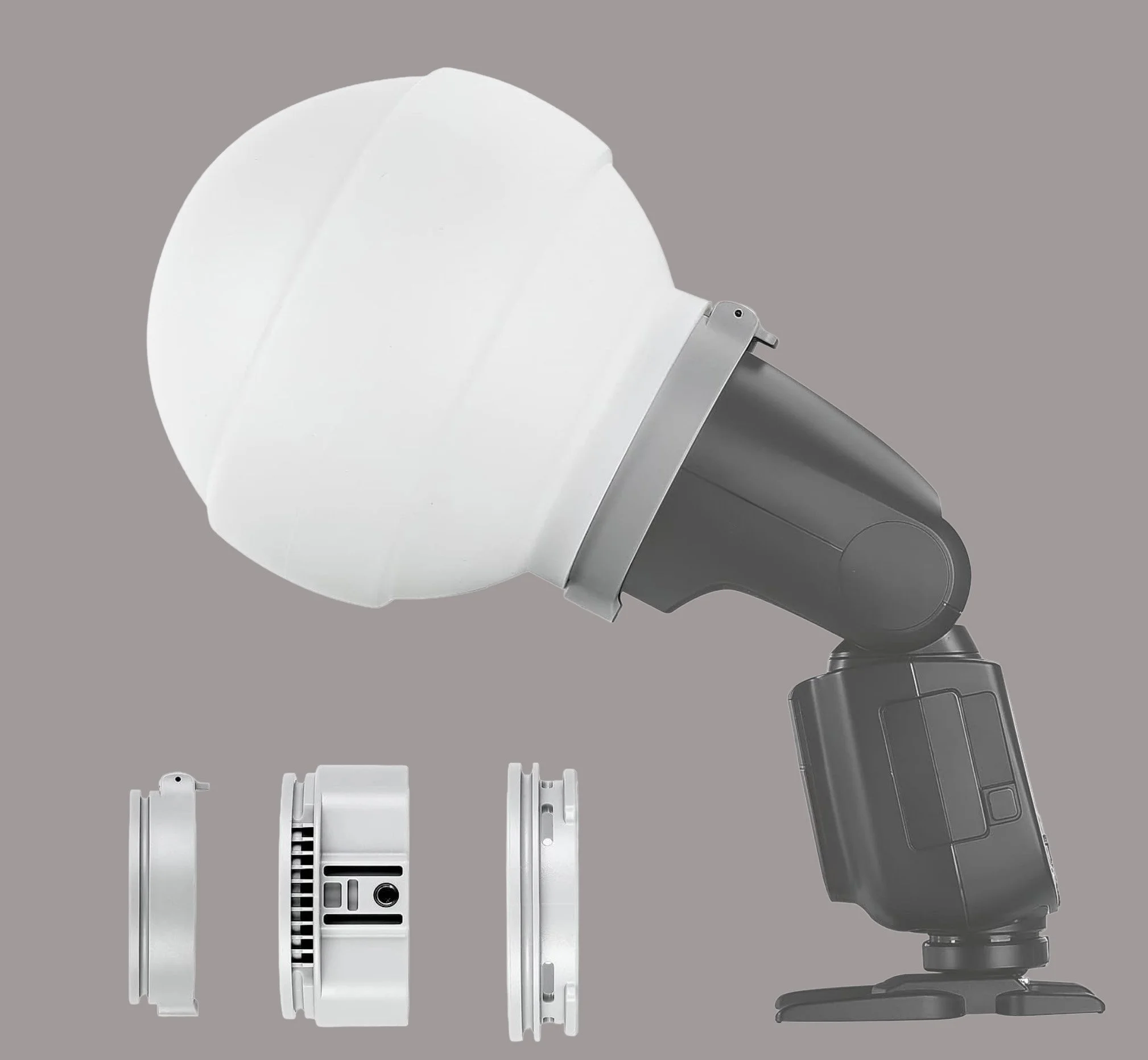 Of course, the speed light shown does not come with the kit, but the Godox ML-CD15 Diffusion Dome w/3 adapters, Flash Light Diffuser is $24.90 from Amazon.